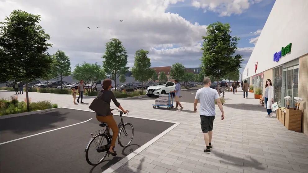 Visualisering af ny fordelingsvej, omlægning af p-arealer og forbedret forareal til boksbutikkerne ved Birkedalsvej.