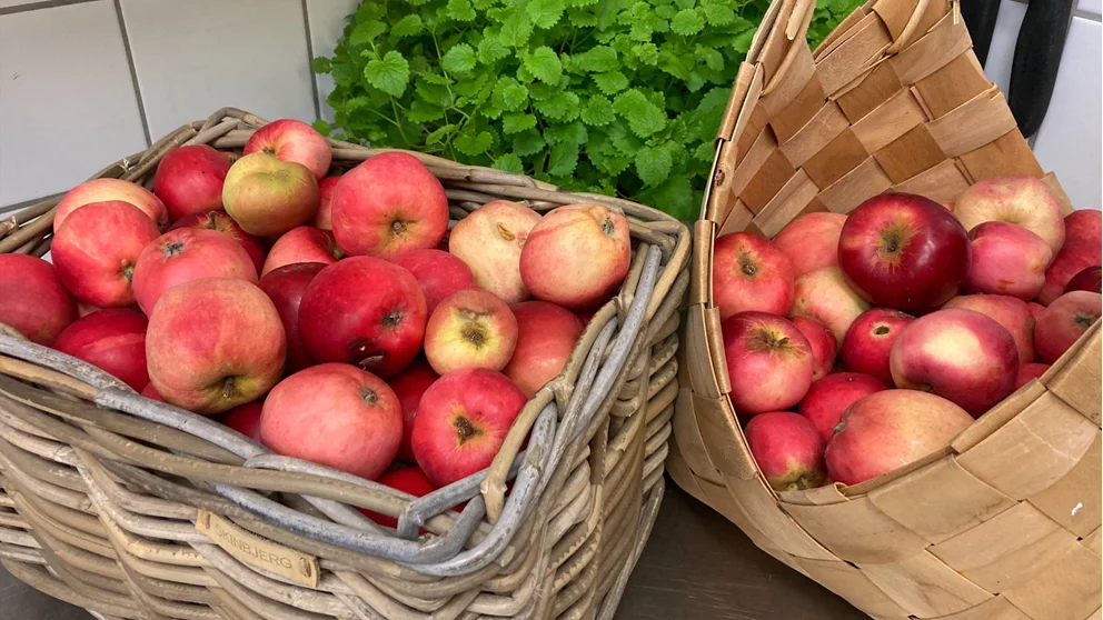 Vores æbler til sensommerens desserter kommer direkte fra vores direktørs egen have. Vi bruger en del af dem til Tarte Tatin men laver ellers god, gammeldaws æblekage til vores ”dagens kage ” eller forplejning til vores konference gæster," siger Christina Dunker.