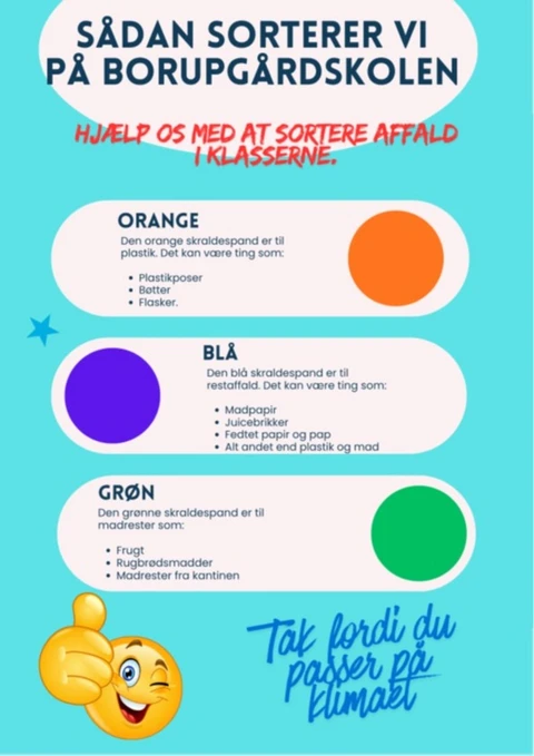 - Et andet forslag fra Borupgårdskolen har fået 8.000 kroner til at købe flere skraldespande, så det er nemmere at sortere affald. Eleverne har også lavet en flot plakat om, hvordan affaldet skal sorteres.