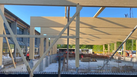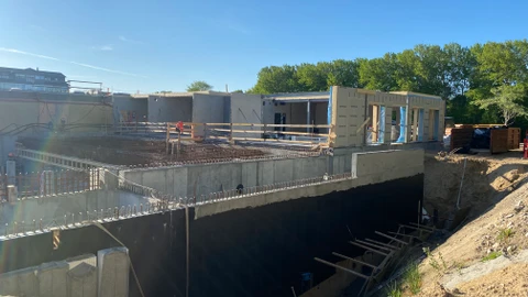 Alt det arbejde, der tager længst tid, er jo det, der ligger under jorden. Støbning af fundament, armering af bassiner, tekniske installationer og så videre. Det har entreprenøren arbejdet på siden byggestart i januar sidste år. Men nu er vi i gang med at rejse vægge og spær - og det går stærkt med at få byggeriet under tag. Efter rejsegildet går der ikke længe før vi kan lægge fliser i bassinerne og på promenadedækket, formentlig i starten af juni, fortæller Jan Krog Islin.