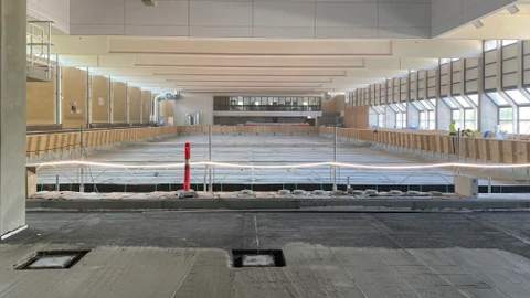 I den eksisterende svømmehal, der er under renovering, er arbejdet også langt. Omklædningsrum og ankomstområde er stort set færdige. Arbejdet med at klargøre 50 meter bassinet, samt tribunen og promenadedækket omkring, skrider også frem og til juli er man så langt, at bassinet kan efterfyldes og nå op på de svimlende 2 mio. liter vand, som det kan rumme.