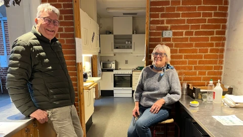 Peter og Oddrunn hyggesnakker, inden eleverne kommer efter deres frokost.