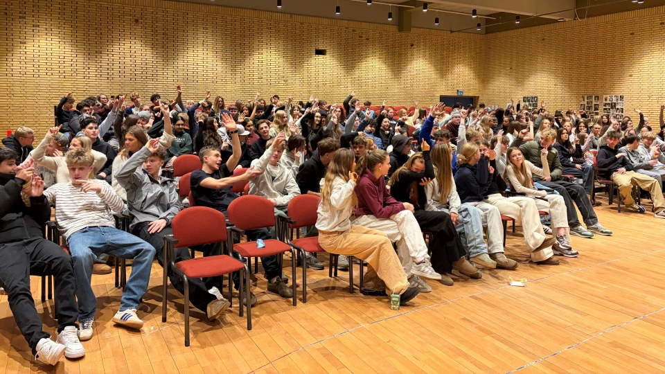 En skov af hænder røg i vejret, da ordstyrer Michael Mathiesen spurgte de ældste elever på Borupgårdskolen, om skoledagene skal være kortere.