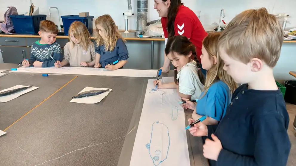 Børnene mimrer lidt og rynker på næserne, da de myldrer ind i Natur & Teknik-lokalet på Skolen ved Gurrevej. Den er god nok. Der lugter af sild, fordi fiskene er en vigtig del af den workshop, som huskunstner Rune Fjord leder her i foråret. Et par hundrede børnehavebørn og skoleelever fra lokalområdet deltager. De maler sild med farver, så deres strømlinede former og fine skæl kan bruges til stoftryk eller lægger sildene i gipsforme, så de efterlader deres aftryk.